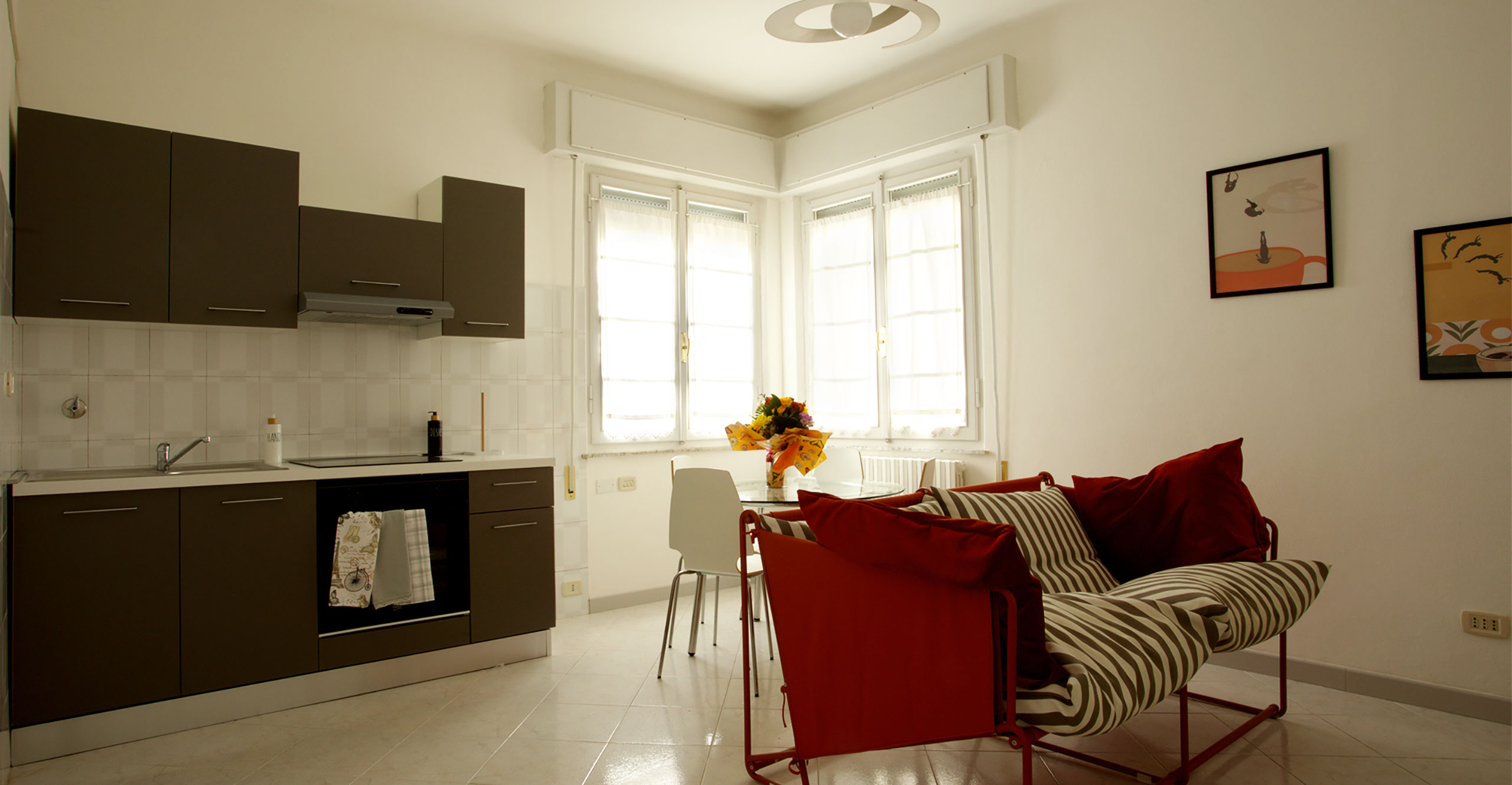 L’appartamento è dotato di tutti gli accessori ed è composto da cucina-soggiorno, due grandi camere matrimoniali e un bagno con ampia doccia.